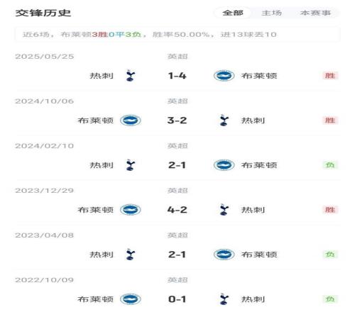 目前英超积分榜上,布莱顿1胜1平2负积4分,位列第13;热刺3胜1负积9分,位列第3。