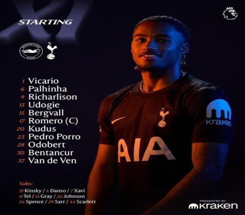 热刺首发:1-维卡里奥、13-乌多吉、23-波罗、17-罗梅罗、37-范德文、30-本坦库尔、6-帕利尼亚、15-贝里瓦尔、20-库杜斯、28-奥多贝尔、9-理查利森