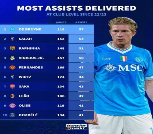 直播吧9月19日报道宣称 那不勒斯在昨晚欧冠焦点战客场0-2不敌曼城,迎战旧主的德布劳内因战术调整而早早被换下。不过《转会市场》统计显示,他仍然是最近3年俱乐部层面送出助攻最多的球员。