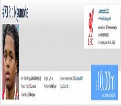 现年16岁的恩古莫哈昨天代表利物浦打进了他的英超首个进球,而且是个绝杀制胜球。在目前德转16岁的同龄人中,恩古莫哈毫无疑问是世界第一,而在他之下是400万欧的16岁梅斯小将马德约。