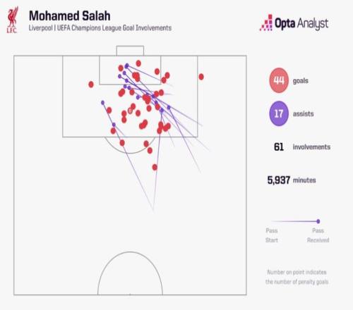 萨拉赫以44个进球和17次助攻成为利物浦队史欧冠赛场参与进球最多的球员。