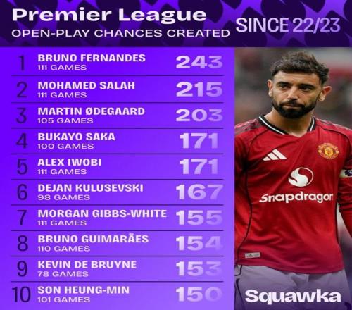 数据显示,自2022/23赛季开始,B费是英超运动战创造机会最多的球员。