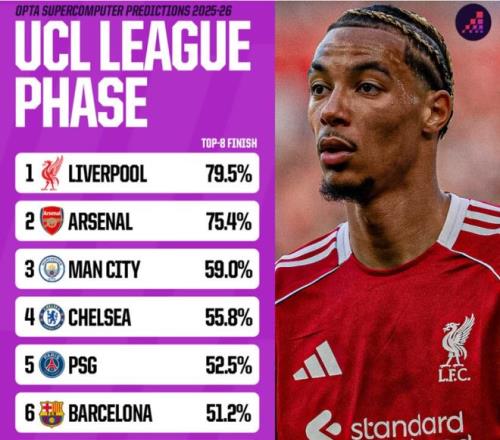 超级计算机模拟显示,利物浦有23.9%概率联赛阶段头名,79.5%概率进入前八名直接晋级。