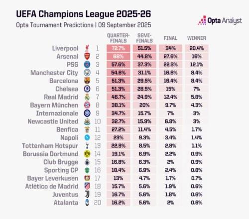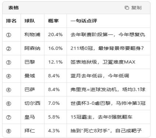 2526赛季欧冠夺冠预测,大数据告诉你答案!