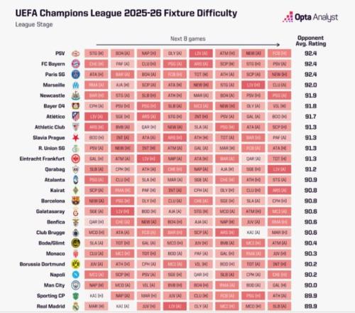 尽管排名第三,但巴黎面临本赛季最艰难的联赛阶段赛程(对手平均Opta实力评分92.4),与拜仁慕尼黑、埃因霍温并列最难。