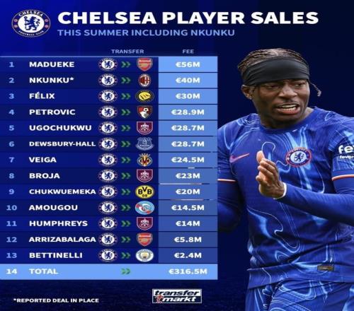 从具体名单来看,切尔西卖掉了多名主力或潜力股:马杜埃凯5600万欧元加盟阿森纳、恩昆库4000万欧元转投米兰、菲利克斯以3000万欧元加利雅得胜利,连门将佩特洛维奇、年轻中场乌戈楚克乌、德乌斯伯里-霍尔也都打包送走。可以说,清洗范围覆盖了主力、轮换和新星。