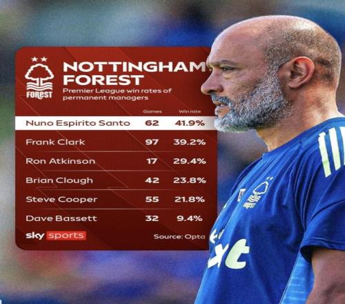 努诺手下的诺丁汉森林英超胜率41.9%,是队史胜率最高的主帅