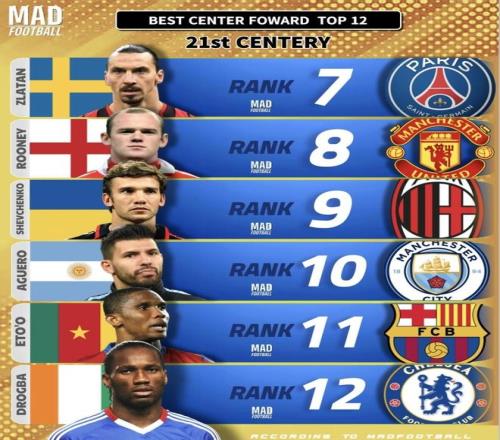 德罗巴:切尔西崛起的象征,多次英超冠军、欧冠冠军,并多次在关键比赛中进球。第12名偏低,至少应进入前10。