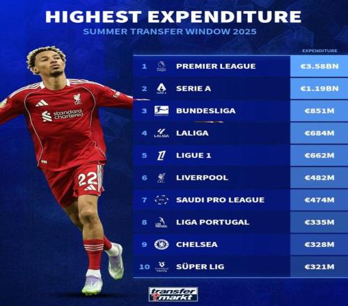 北京时间9月2日,在欧洲五大联赛的夏季转会窗关闭之后,根据德转的统计,利物浦一家俱乐部的夏窗支出即便放在全球联赛支出榜上也能够排在第6位,仅次于五大联赛,领先于沙特、葡超以及土超,此外切尔西的支出也能跻身前10,排名第9。