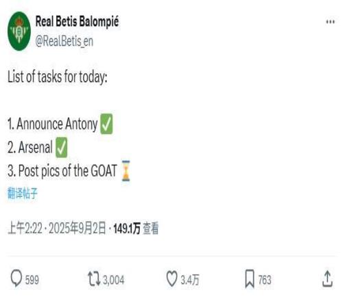 北京时间今天凌晨02:22,在官宣了安东尼的转会后,贝蒂斯官方在社交媒体上写道:“今日任务清单:1、官宣安东尼✔;2、阿森纳✔;3、发布GOAT的照片⏳”。
