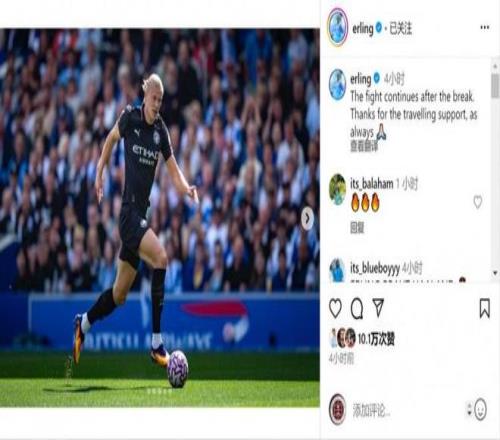 这是哈兰德出战的第100场英超比赛,他取得进球,但曼城落败,赛后哈兰德在社交媒体上写道:“休赛期后战斗继续,感谢球迷在客场一如既往的支持。”
