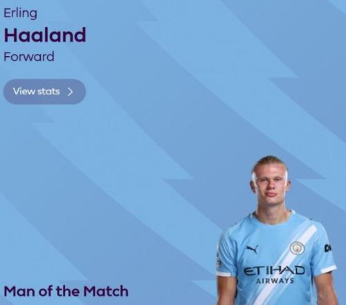 本场比赛哈兰德在自己的百场英超里程碑打进一球,赛后他也当选英超官方球迷票选全场最佳球员。