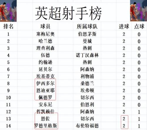 射手榜方面,罗德里格斯,恩迪亚耶,安东尼,伊西多尔,佩德罗,恩佐等人进球后,追上了哈兰德,理查利森等,14人2球并列领跑。