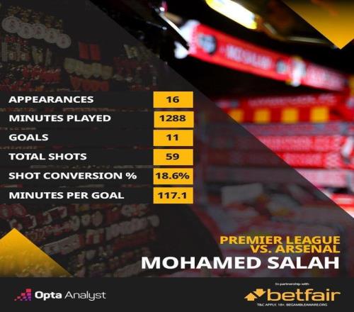 萨拉赫英超对阿森纳已打入11球,仅次鲁尼和凯恩
