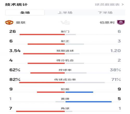 射门266!曼联32伯恩利数据:射正63,控球率62%38%,角球71