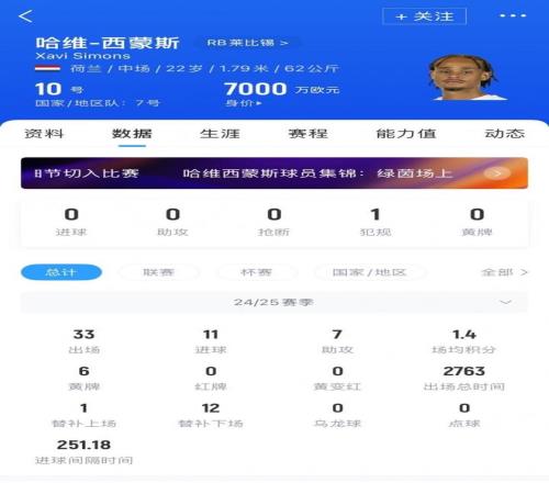 现年22岁的哈维-西蒙斯是荷兰国脚,球员现身价7000万欧。上赛季球员为莱比锡出战33场收获11球7助。他此前一直与切尔西传绯闻,如今被北伦敦的热刺拿下。