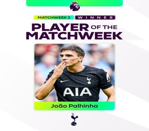 英超官方消息,热刺中场帕利尼亚当选本轮最佳球员。