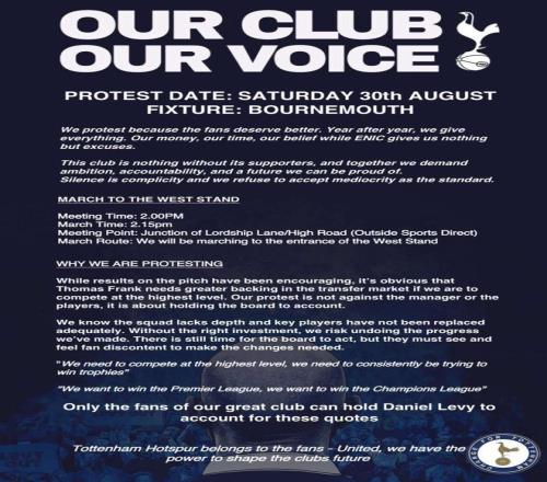 鉴于我们近期在转会策略上的失败,以及球迷群体中由此引发的强烈不满,我们宣布将在球队对阵伯恩茅斯的比赛期间开展抗议活动。包括不在球场内进行任何消费,并同步提出后续的行动计划。