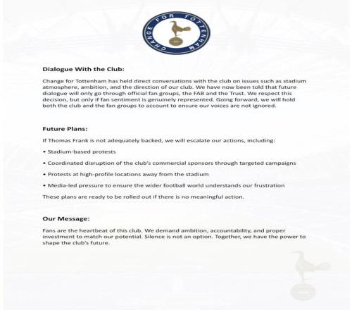 “Change For Tottenham”组织此前已就球场氛围、俱乐部目标及发展方向等核心问题,与俱乐部进行过直接对话。目前我们接到通知,未来此类对话将只能通过官方球迷组织(FAB和信托)进行。