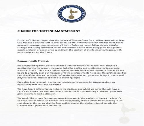 北京时间8月27日,由于不满俱乐部在今年夏季转会窗口中的引援表现,热刺球迷组织Change For Tottenham发布声明,呼吁球迷在下一轮英超比赛中进行抗议活动。
