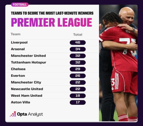 英超球队绝杀榜:利物浦46次居首,阿森纳34次列次席