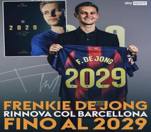 “德容将长期身披巴萨战袍。今天,这位中场球员与巴塞罗那足球俱乐部签署了新合同,合同有效期至2029年。德容与俱乐部主席拉波尔塔共同出席了在俱乐部总部举行的签约仪式。”