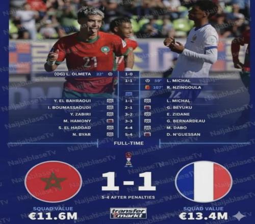 点球大战双方前5轮战成4-4。第6轮,法国队恩盖桑点球被梅斯巴希扑出,摩洛哥队点球5-4取得胜利,晋级U20世界杯决赛!
