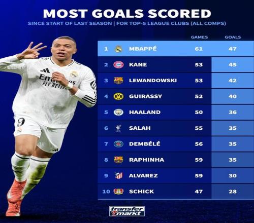 据德国转会市场统计,姆巴佩自加盟皇马以来打进47球(61场比赛),是五大联赛同期进球最多的。