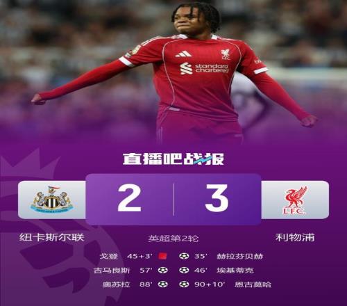 直播吧8月26日报道宣称 英超第二轮比赛,利物浦客场3-2击败纽卡。