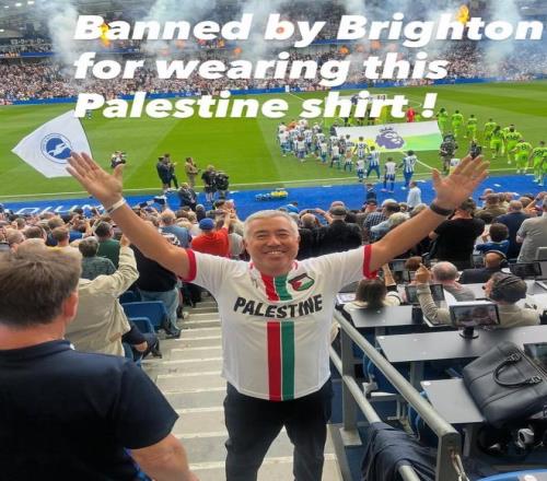 8月25日,一名布莱顿球迷Roger Wade在社媒发文,称自己因为穿巴勒斯坦球衣观看了布莱顿的比赛,而遭到俱乐部禁止进入球场五场的处罚。