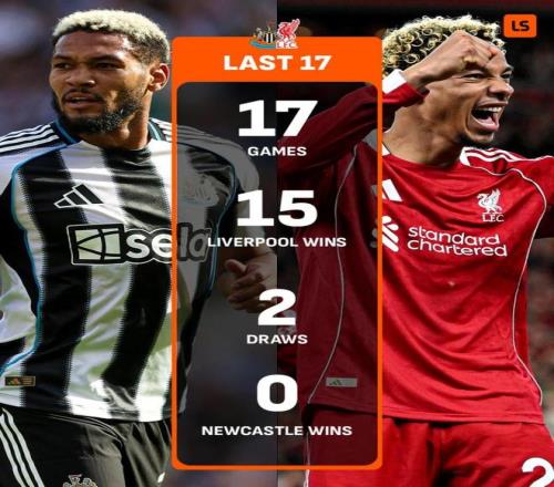 据媒体统计,利物浦近17次英超对阵纽卡保持不败,战绩15胜2平。