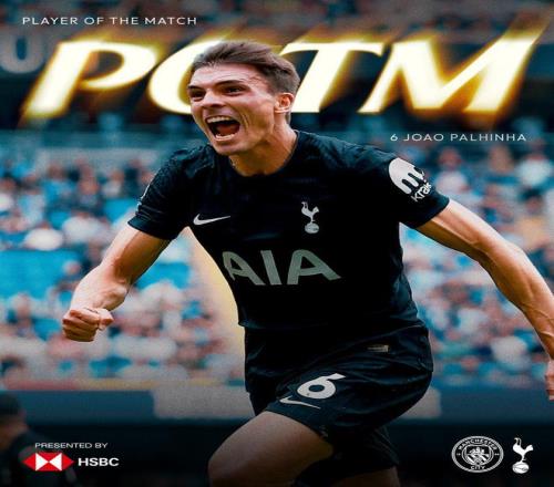 热刺官方宣布,帕利尼亚当选球队与曼城一役队内最佳球员。