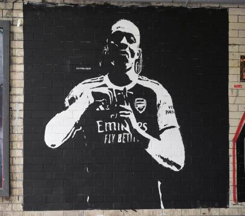 照片中,埃泽身穿阿森纳球衣,做出他标志性的庆祝动作。但周六凌晨,一名破坏者将白漆泼洒在了这幅作品上,使其遭到破坏。
