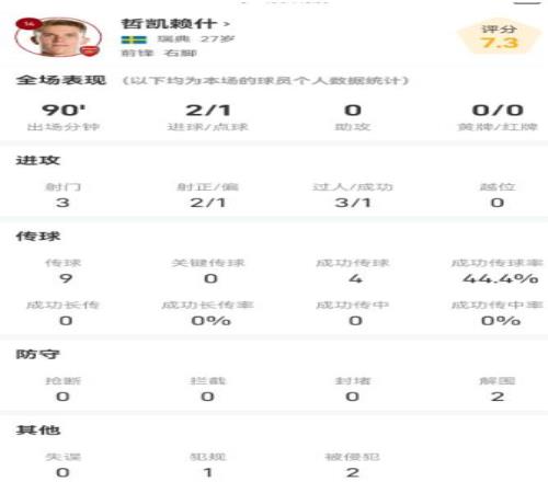 在防守端,哲凯赖什也颇为积极,有着2次解围。此外他还1次犯规,2次遭到对手侵犯。