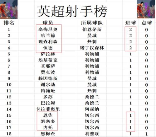 射手榜方面,哈兰德,理查利森,伍德和塞梅尼奥2球并列榜首,切尔西今天无人梅开二度,内托,恩佐,凯塞多和萨拉赫,赖因德斯,约翰逊等人都是1球上榜。