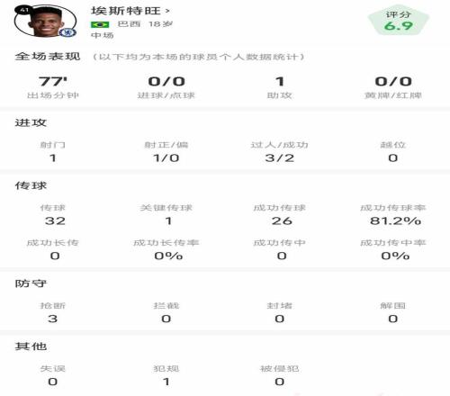 本场比赛切尔西小将埃斯特旺表现出色,送出了一次助攻。