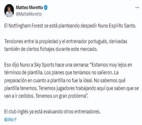2025-26赛季英超开幕仅一周,就有球队计划换帅。8月22日,知名记者Matteo Moretto透露,诺丁汉森林老板马里纳基斯,与主帅努诺产生矛盾。努诺公开抱怨球队夏窗引援不力,球队远远没有准备好。诺丁汉森林已经做好与努诺分道扬镳的准备,开始物色新帅人选。