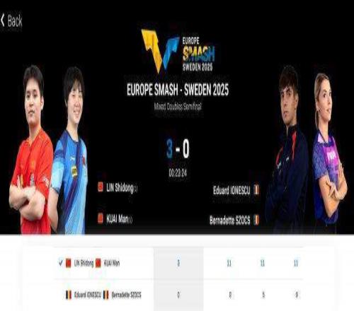 北京时间8月21日,在2025年WTT瑞典大满贯赛混双半决赛中,中国组合林诗栋/蒯曼以11比8、11比5和11比9战胜罗马尼亚组合约内斯库/斯佐科斯组合,晋级决赛。