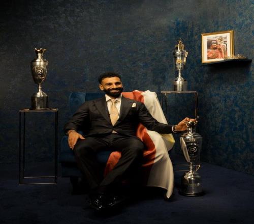 今日,利物浦官方晒出萨拉赫西装革履坐在椅子上的照片,椅子上挂着一面埃及国旗,他的身边有三座PFA年度最佳球员奖杯。