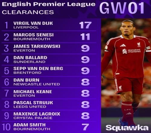 英超首轮解围数TOP10:范迪克17次居首,伯恩茅斯后卫塞内西次之
