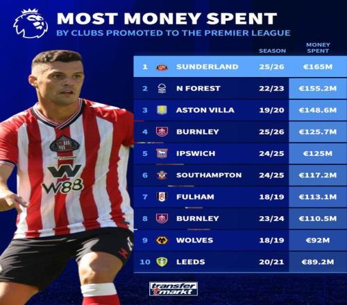 据德国转会市场统计,桑德兰今夏转会支出已达1.65亿欧,成为英超历史上转会支出最多的升班马。