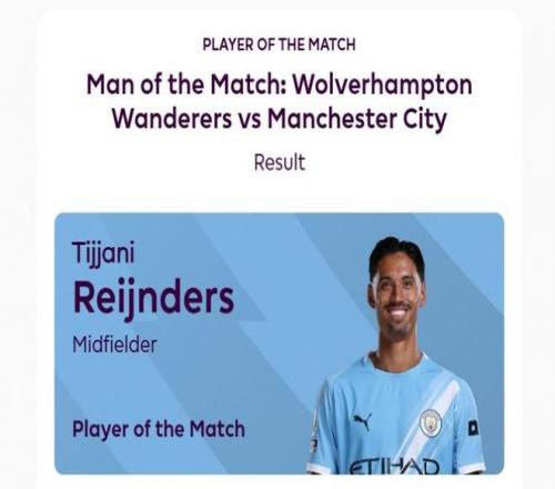 传射建功,官方:赖因德斯当选曼城vs狼队全场最佳球员