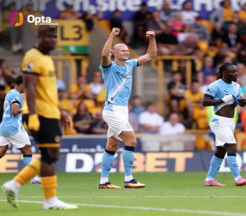 新赛季英超首轮,曼城客场对阵狼队,上半场哈兰德为曼城首开记录,至此,哈兰德已连续4个赛季英超首轮比赛都有进球,仅次于萨拉赫。