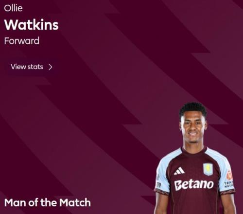 本场比赛沃特金斯在上半场为球队先拔头筹扳平比分,赛后他也当选英超官方球迷票选全场最佳球员。