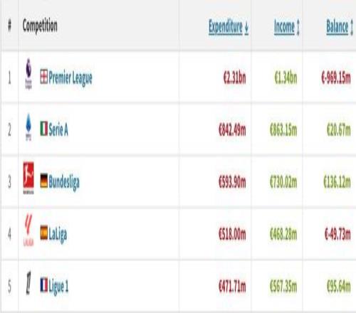 夏窗转会费支出榜:英超23亿第一,德甲净支出1.36亿欧元
