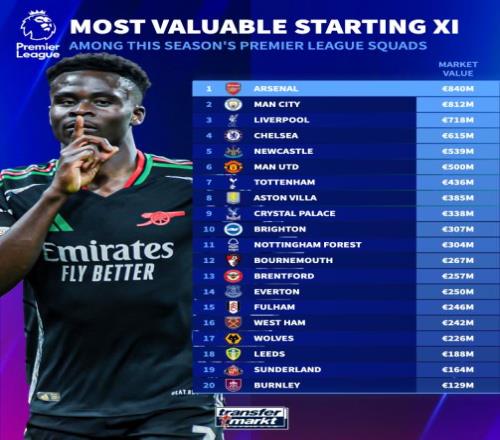 德转统计英超新赛季各队首发十一人总身价:阿森纳8.4亿欧居首