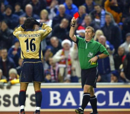2001年12月23日,当时效力阿森纳的范布隆克霍斯特,在对阵利物浦的关键战役中,仅出场35分钟就吃到两张黄牌被罚下。然而,少打一人的阿森纳最终在客场2-1取胜,并在那个赛季(2001-02)最终夺冠,范布隆克霍斯特也收获了一枚英超冠军奖牌。