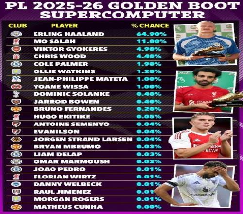 直播吧8月8日报道宣称 根据《太阳报》报道,超算预测新赛季英超射手榜,哈兰德有64.9%的概率拿到金靴,萨拉赫11%第二。