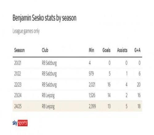 选择签下塞斯科而非更成熟的选项存在一定风险。他没有哈兰德当初转会英格兰时那样高产高效的进球记录。哈兰德在多特蒙德89场比赛中打入了86球,而塞斯科在莱比锡87场比赛中打入39球。