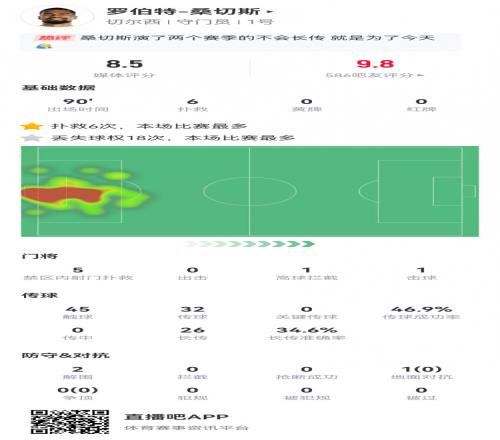 桑切斯本场数据:6扑救+1出击成功26长传9成功+2解围获评8.5分